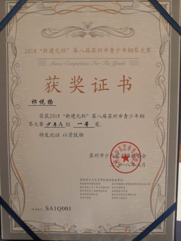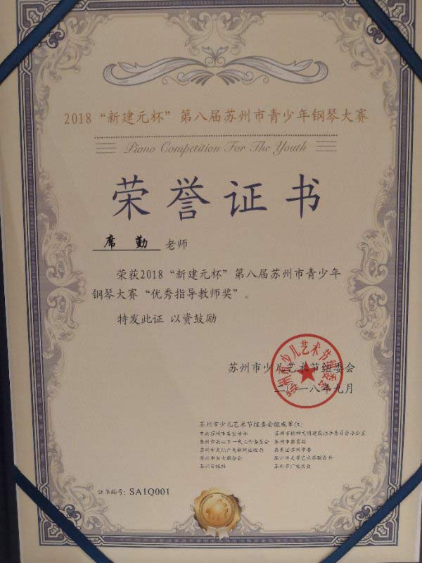 席勤:優(yōu)秀指導教師獎 席勤老師獲得 2018“新建元杯” 第八屆蘇州市青少年鋼琴大賽 優(yōu)秀指導教師獎