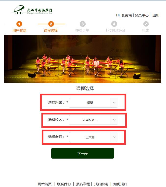 1.選擇樂(lè )器課程,先要選擇樂(lè )器類(lèi)別,學(xué)校,老師然后在選擇課程,如圖